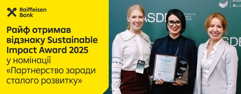 Райффайзен Банк відзначено премією Sustainable Impact Award 2025 у спеціальній номінації «Партнерство заради сталого розвитку» від Глобального договору ООН в Україні, Association of Sustainable Development Experts (ASDE) та Ukrainian Sustainable Finance Alliance (USFA). Церемонія нагородження відбулася 30 жовтня у Львові під час 5-го Міжнародного форуму зі сталого розвитку ISF 2025.