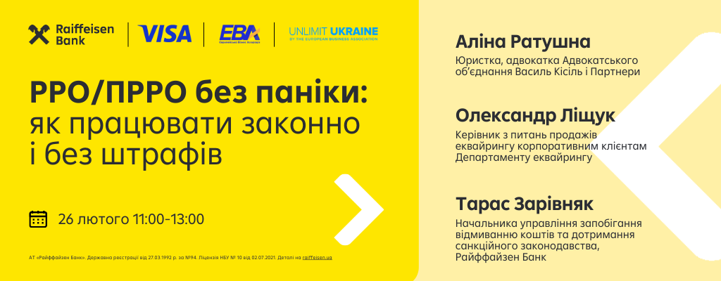 Пропонуємо обговорити онлайн цю актуальну тему разом із Аліною Ратушною, юристкою, адвокаткою Адвокатського обʼєднання Василь Кісіль і Партнери, Олександром Ліщуком, керівником з питань продажів еквайрингу корпоративним клієнтам департаменту еквайрингу Райффайзен Банку, та Тарасом Зарівняком, заступником директора департаменту, начальником управління запобігання відмиванню коштів та дотримання санкційного законодавства Райффайзен Банку.
